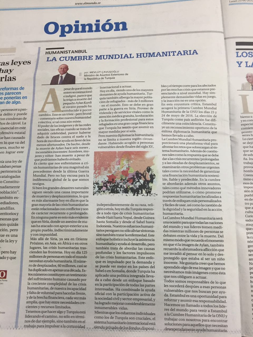 El artículo "HumanIstanbul: La Cumbre Mundial Humanitaria", escrito por Su Excelencia Sr. Mevlüt Çavuşoğlu, Ministro de Asuntos Exteriores de la República de Türkiye, fue publicado en el diario "El Mundo" de El Salvador el lúnes 25 de abril de 2016.